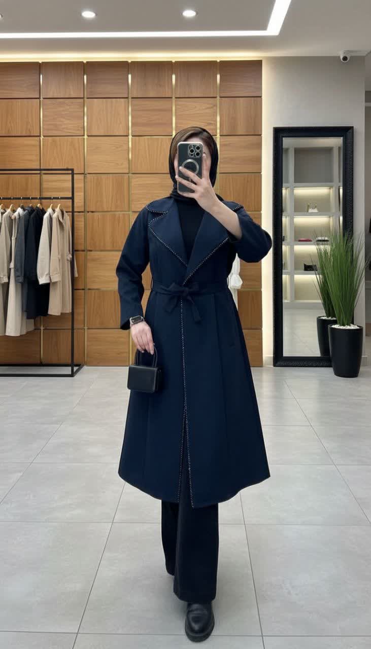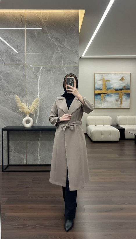 مانتو زنانه بلند هرمس بیسکوییت با حاشیه جواهر دوزی